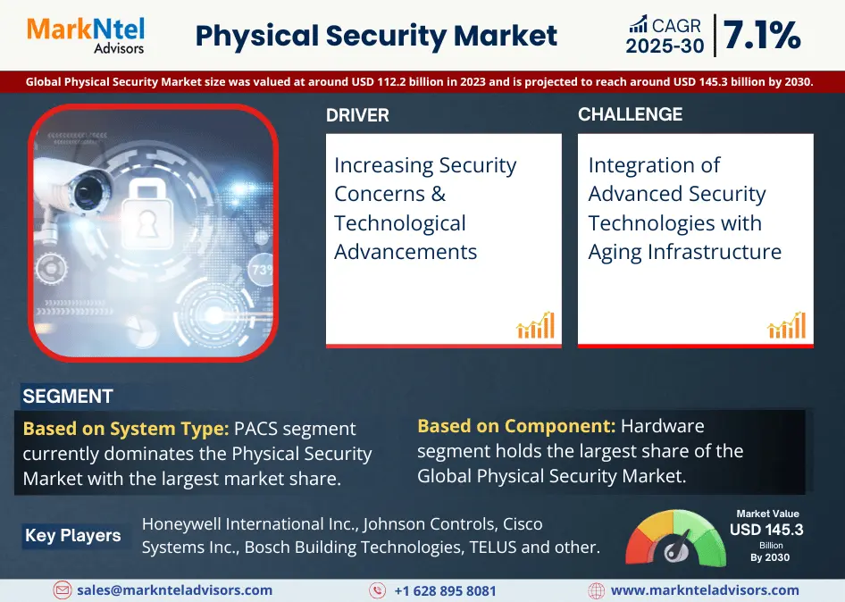 MarkNtel Advisors, a leading market research and consulting firm, has announced the release of its latest study titled Physical Security Market Research Report: Forecast (2025–2030). This report provides a detailed assessment of the Physical Security Market, covering its evolving dynamics, emerging trends, key growth drivers, major challenges, and competitive landscape.