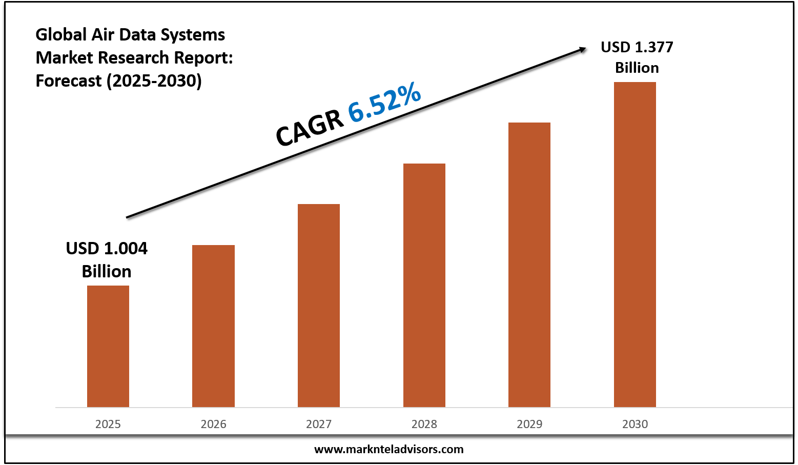 The Global Air Data Systems Market is poised for remarkable growth, projected to reach approximately USD 1.377 billion by 2030, up from USD 1.004 billion in 2025, at a compound annual growth rate (CAGR) of 6.52%. This growth is driven by the relentless modernization of aircraft and the increasing need for data efficiency in aviation operations. Demand for advanced air data systems, particularly within military aviation and unmanned aerial vehicles (UAVs), fuels this expansive growth. Key factors also include rising investments in research and development from both public and private sectors, aimed at enhancing safety and performance in flight operations.